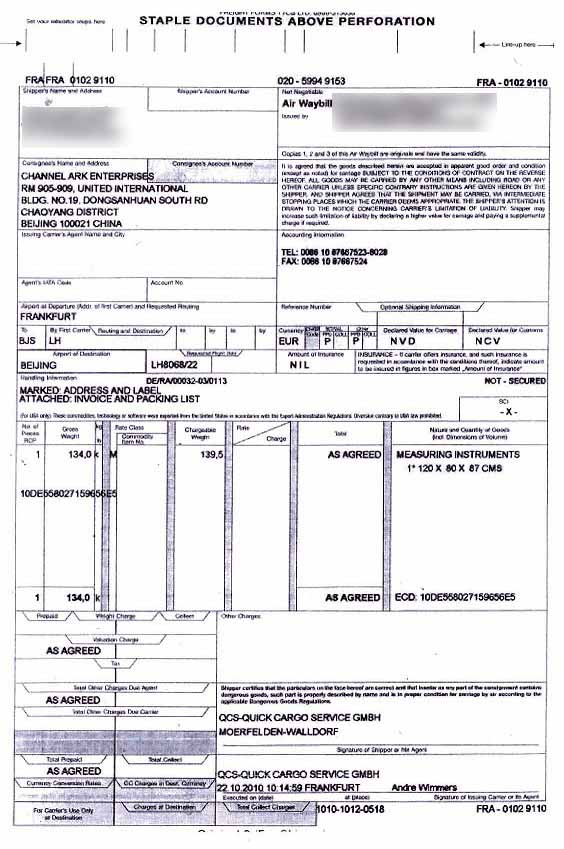 進口空運提單復印件